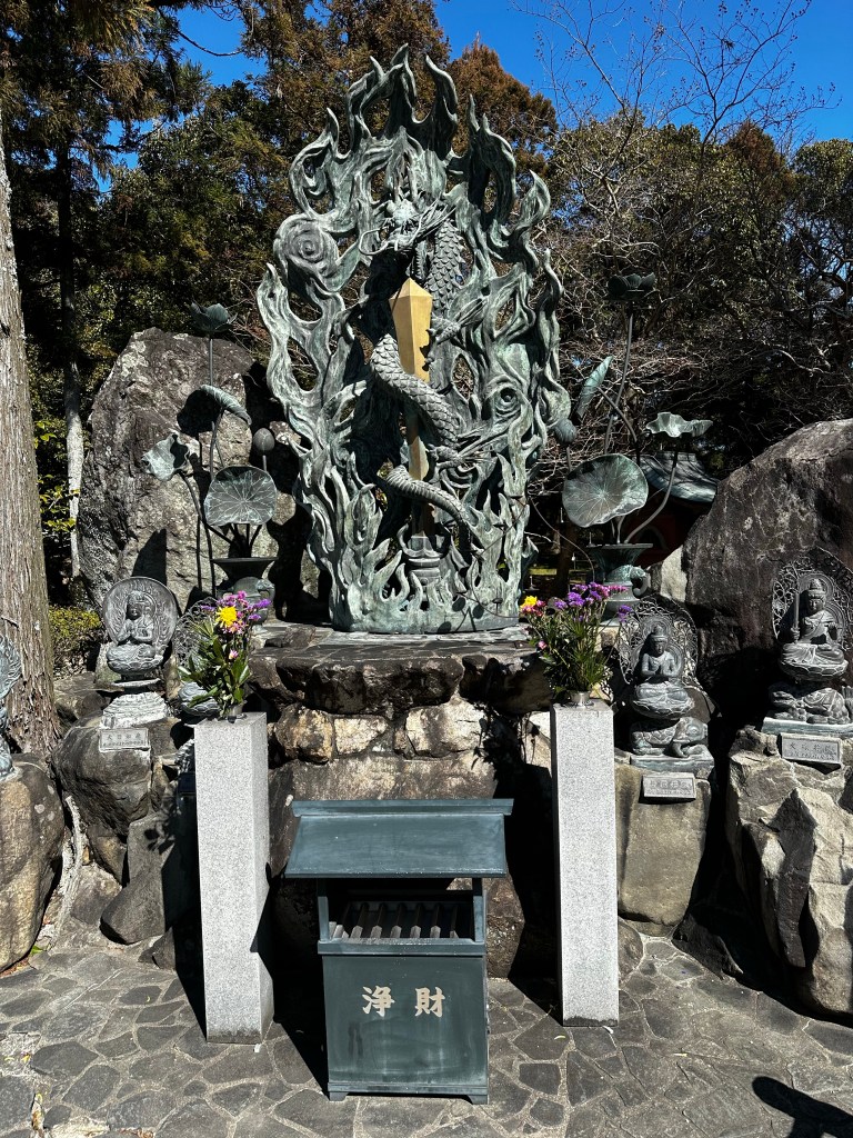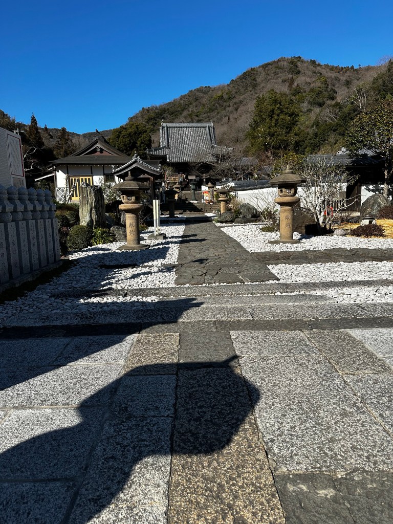 We nailed Ryozenji (Temple 1) – a term and ritual I will describe later – and proceeded to Gokurakuji (Temple 2). It was about a 15 minute walk between temples. At each temple we visit the Hondo (Main Hall) and Daishido (Daishi Hall) before going to temple office to get our temples stamps. I had decided early in my planning that I wanted a hanging scroll with the temple stamps instead of the regular nokyocho (stamp book) carried by most pilgrims. It was after noon as we departed for Konsenji (Temple 3). Though we both were getting a bit hungry, we agreed to delay lunch until after Temple 3.