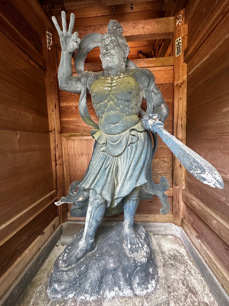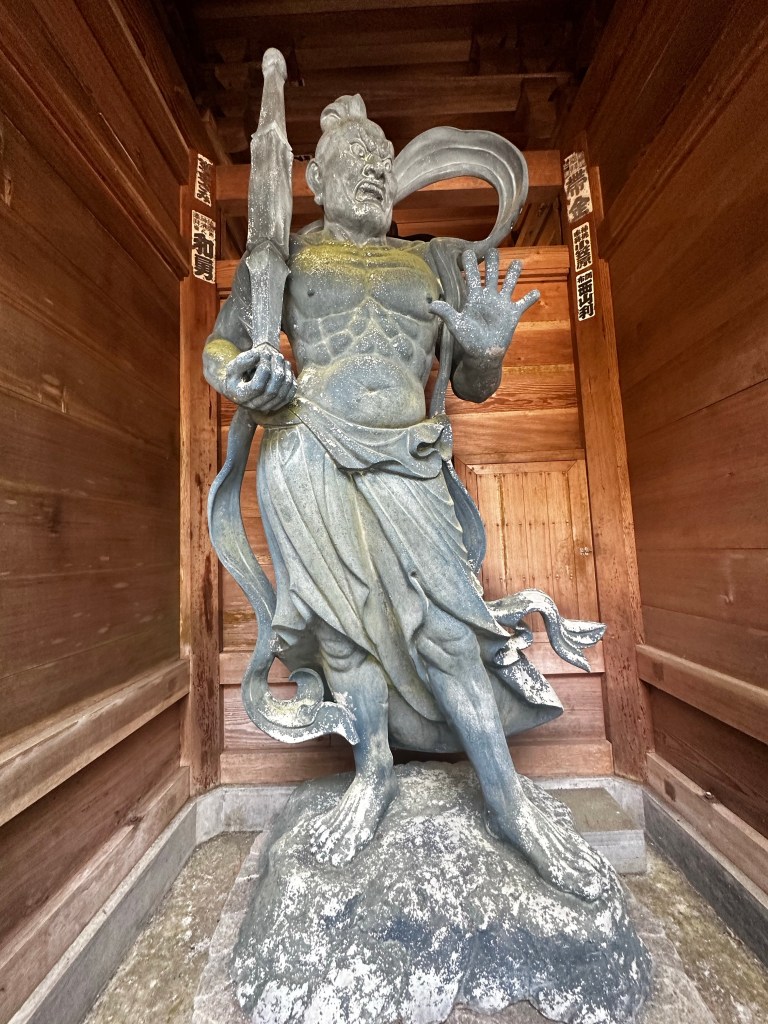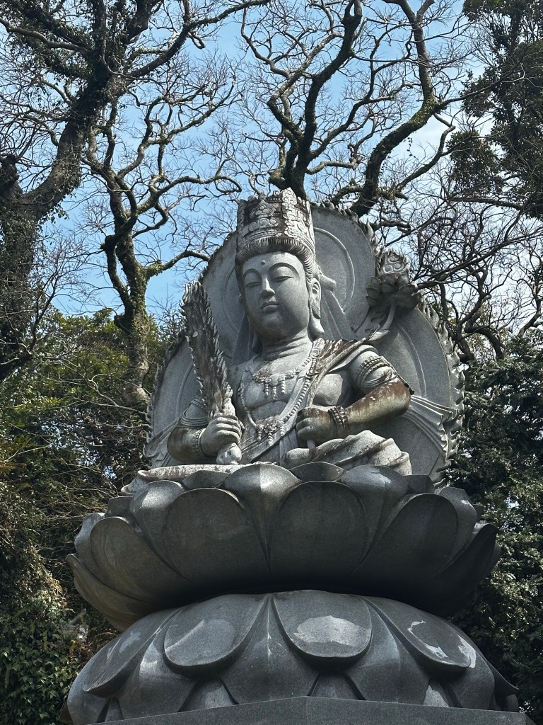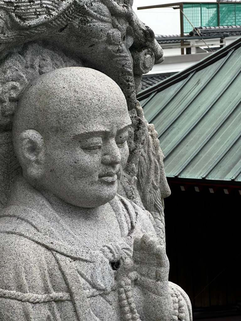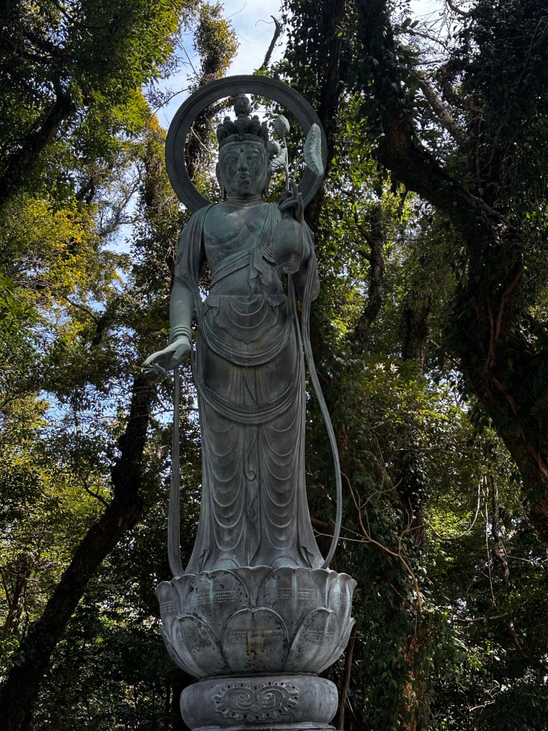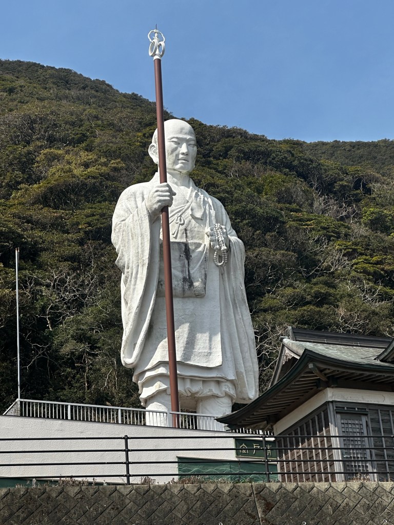 After two-and-a-half hours, we came upon a giant statue of Kukai looking out over the ocean from the temple complex of Raieiji. There is a mini map of Shikoku under his sandaled feet showing the (very loosely approximate) location of each of the temples in the Shikoku 88 Temple Pilgrimage.