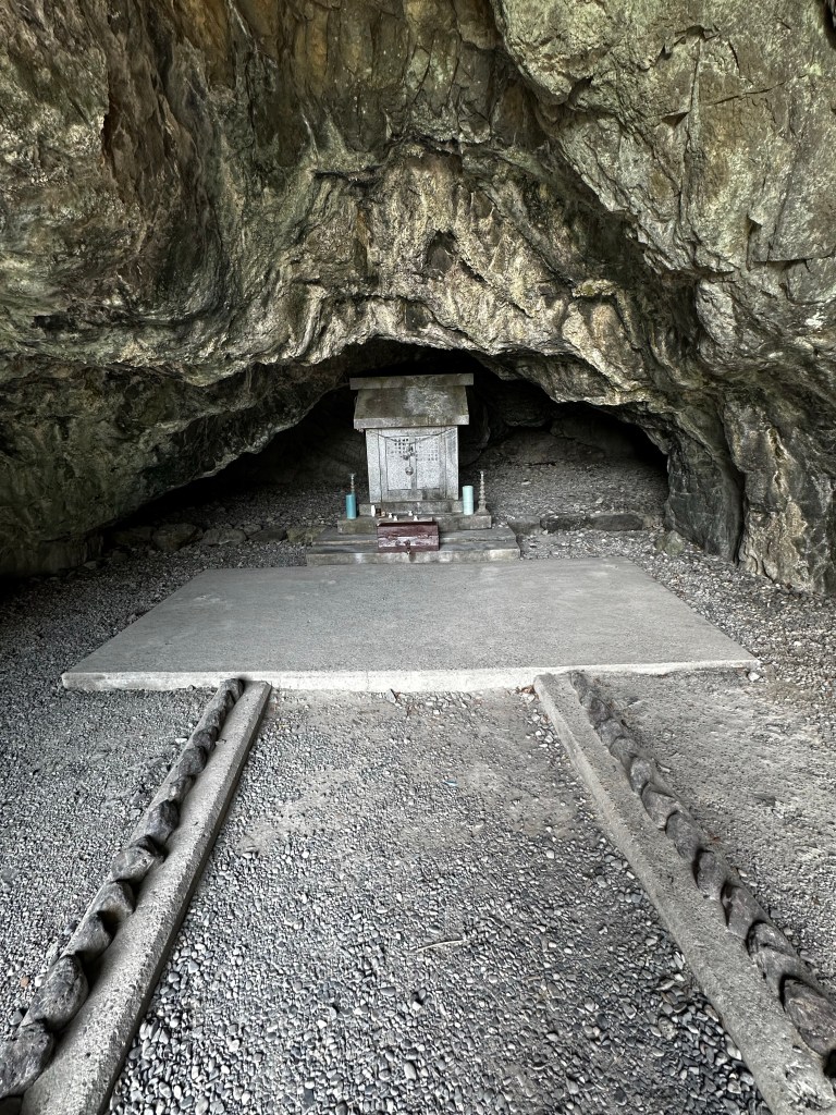 Kukai says while meditating here he saw the morning star fall and jump into his mouth and attained enlightenment. Looking out from the cave he could see the sky (空) and the sea (海) and thus took on the name 空海 (Kukai). His given name was Mao. Approximately 100 years after his death in 835 C.E., he was given the posthumous name of Kobo Daishi (“Great Teacher”).