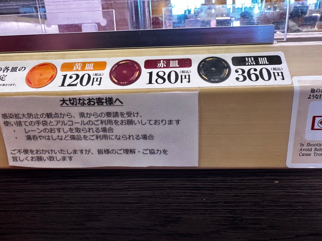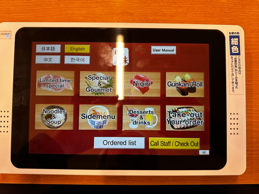 We decided to get some dinner before heading to the hostel we had reserved for the night. We found a conveyor belt sushi joint and thought we’d give it a go. A little confusion at first, but with the assistance of one of the wait staff we were able to get started. You enter and go to a kiosk at the front, enter the number of your party, and get assigned a table on a printed out receipt with a QR Code. After taking your seat, you see that the booth is color coded. We were blue. An electronic ordering tablet very much like an iPad lets you order dishes to be prepared back in the kitchen. After ordering, you only have to wait a few minutes until the tablet starts chirping that your order has been prepared and you should expect it on the conveyor belt running next to the table. Our sushi and other items came out on little color coded plates (indicating price) on color coded plate carriers (indicating table). After dining, scan the receipt with the QR Code assigned to your table at the front cash register and pay your bill.