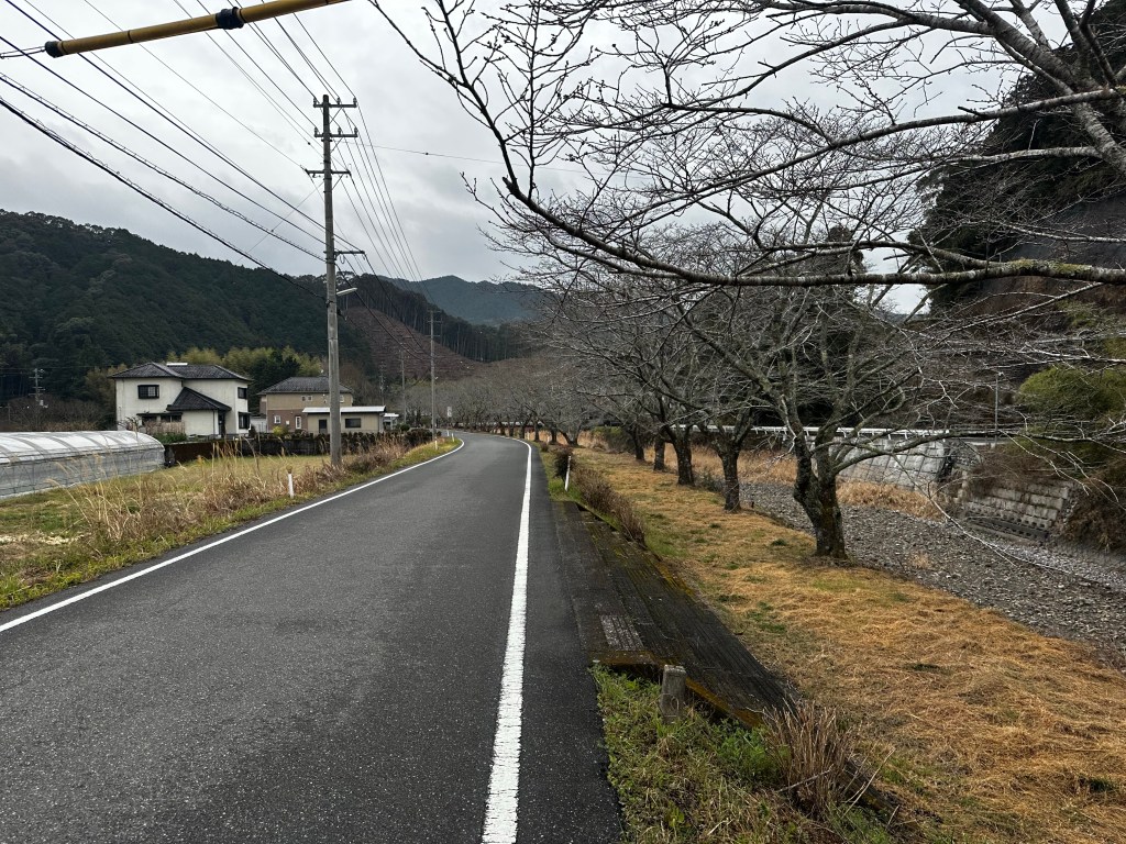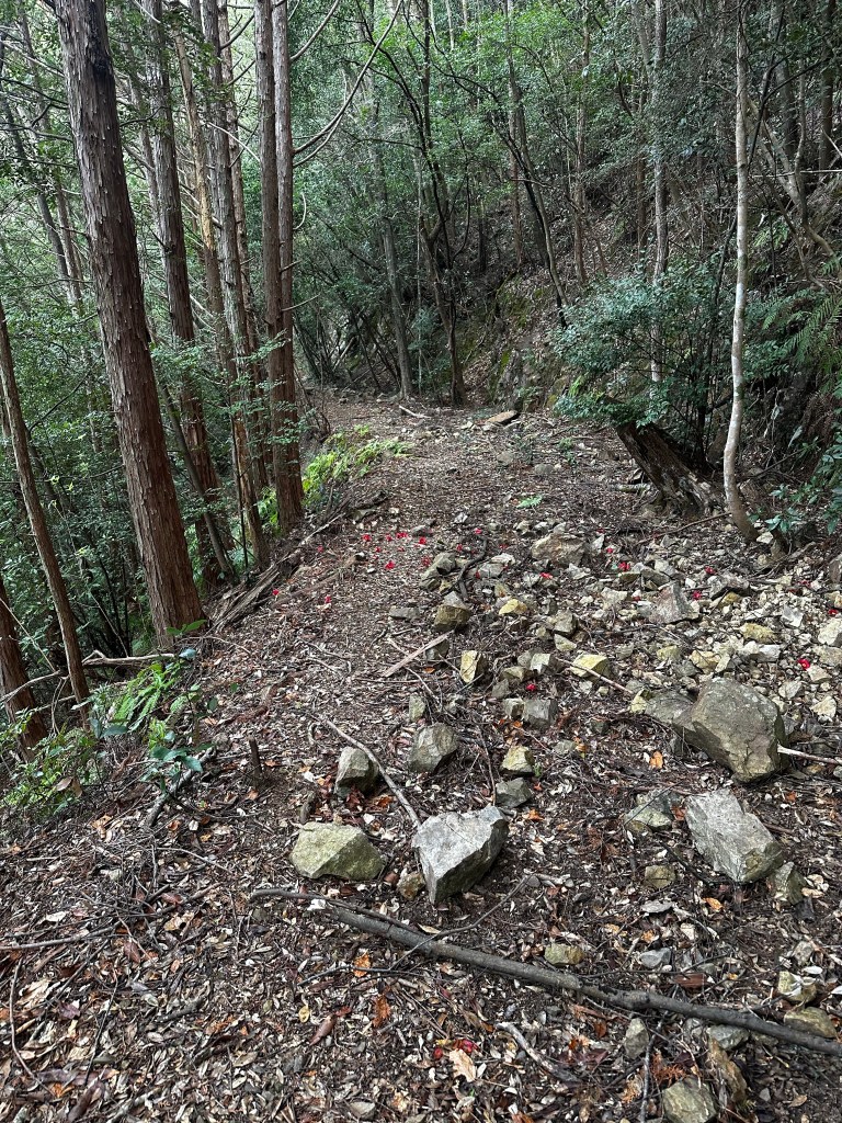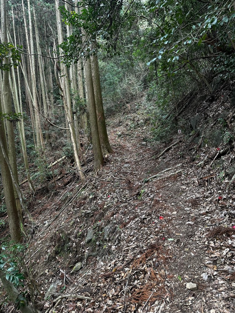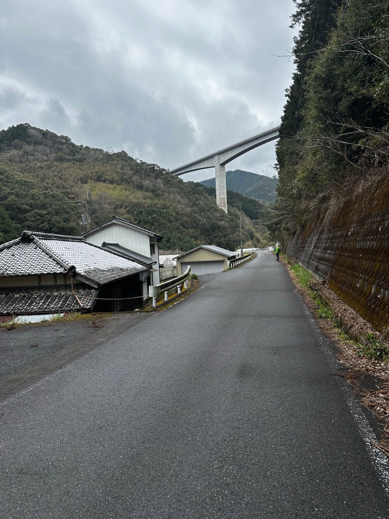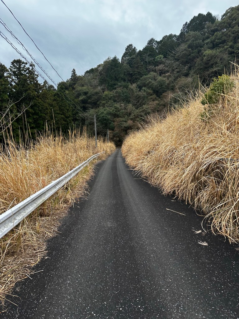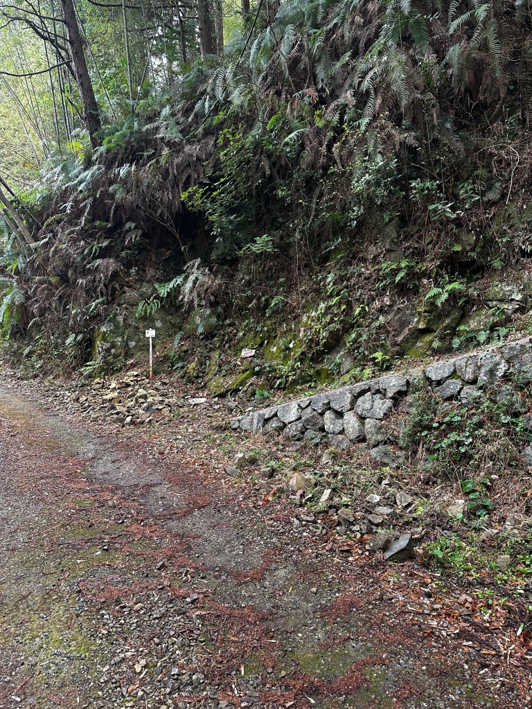 As we exited Susaki City, we followed a railroad track, crossed under and continued to follow it on the other side. A gentleman in a truck stopped next to us (his side of the conversation was entirely in Japanese, so this was our interpretation) and asked if we were heading to the mountain pass and warning us that it was dame (“no good”). We thanked and decided to check the trailhead of the path ourselves to confirm if the path was closed. Next, an older woman stopped next to us and, this time, from what we could make out, we learned we were slightly off course to reach the mountain pass trail. What we needed to do was to go to a tunnel about 100 yards ahead, go through the tunnel under the tracks, and then take a right onto another street following the tracks once again. That was our interpretation, at least. Sure enough. We took the tunnel under the tracks and almost immediately was a henro michi (“pilgrim road”) sign point for us to go right. We had crossed under the tracks too early and were supposed to cross under them a bit further down the road.