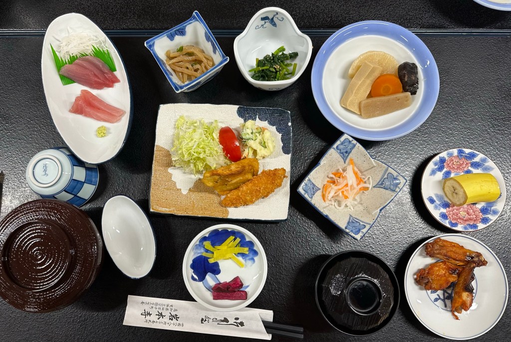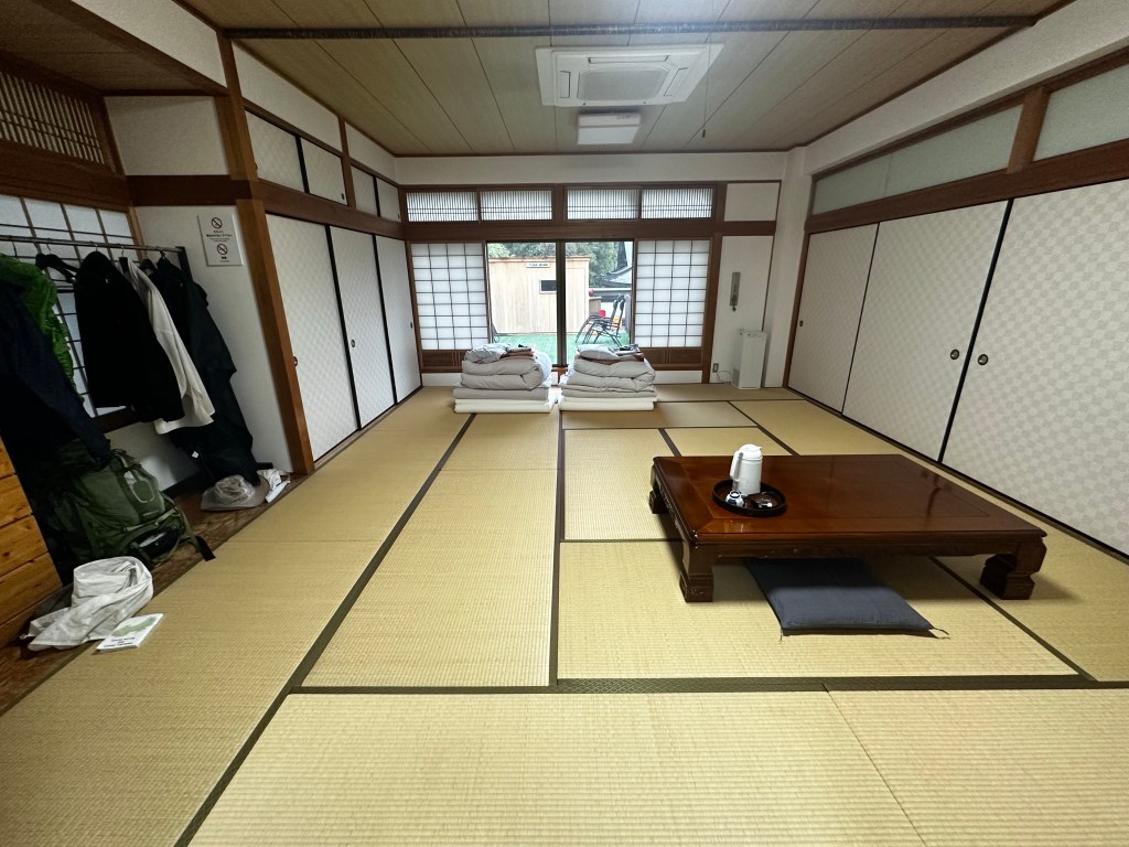 After getting my scroll stamped, I asked at the stamp office concerning the shukubo (“visitor’s lodgings in a temple”). She pointed to the most obvious building on the temple grounds for this and informed me to ask at the front desk. We got checked in easily to a very large and comfortable room on the second floor. It’s the largest room we’ve had so far this trip. Dinner was at 6:00 p.m.