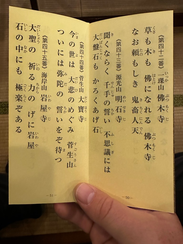 As we were pilgrim guests in the temple, we were invited to attend the morning service. My nephew and I were the only Westerners among the congregation of over a dozen. The rest were Japanese. As we were unlikely to understand even a little of the service, we sat in the back of observe and passively participate. A man, whom I would call the service facilitator, passed around books containing sutras to each member of the congregation. I can phonetically read hiragana and katakana, and I’m familiar with over 400 kanji, so I could at least sound out the sutras even if I didn’t understand them.
