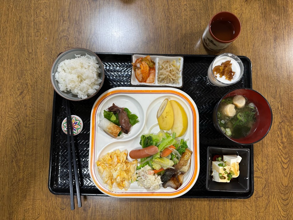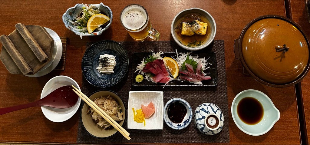 Breakfast at Guest House Okinohama. It may or may not be my first time eating a whole squid (reddish brown item in the upper left on the white plate). I honestly don’t recall.