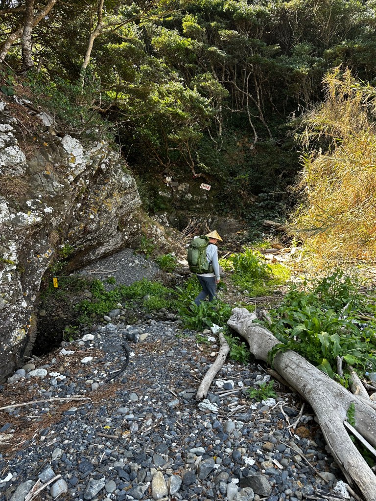 We continue following a side road around the coast until we found a pilgrim sign point out to a rocky beach. Even I had a sense of, “is this some kind of prank?” as there were several more pilgrim signs assuring us that this was indeed the way. We reached a point where the beach ran into a small cliff wall and another set of signs beckoned us back into the woods.