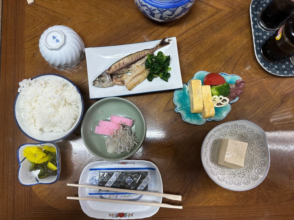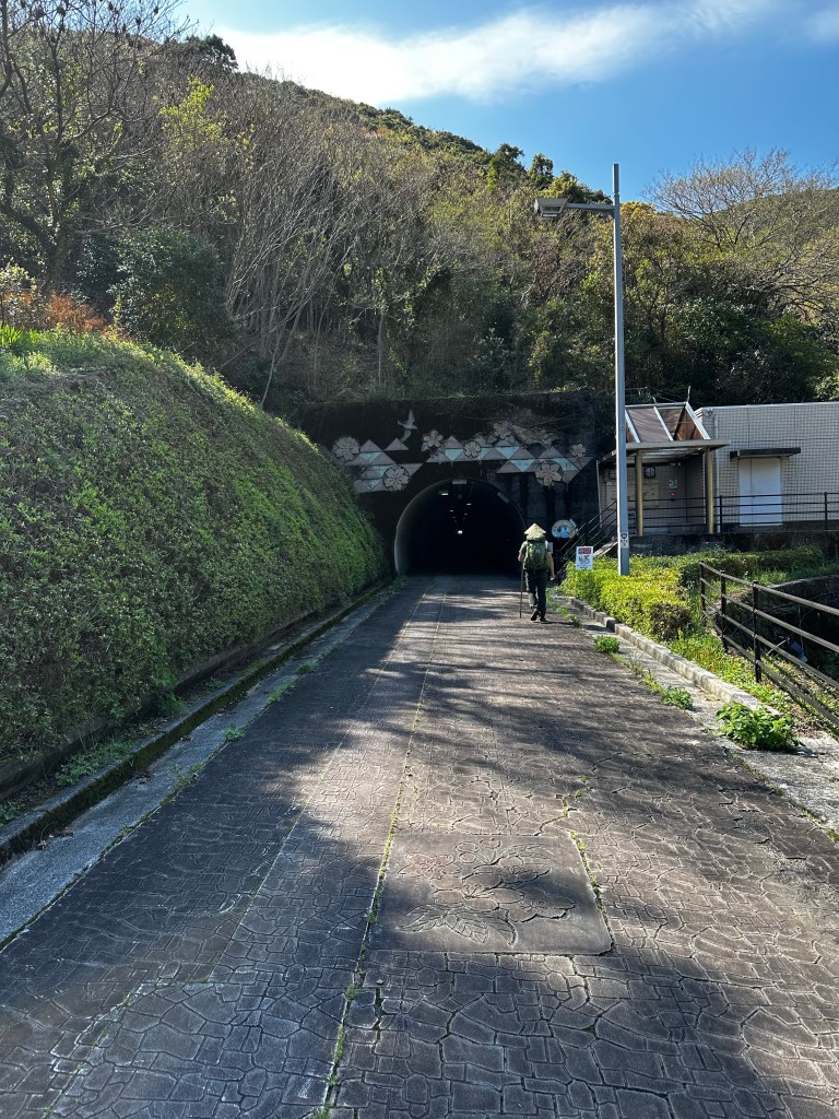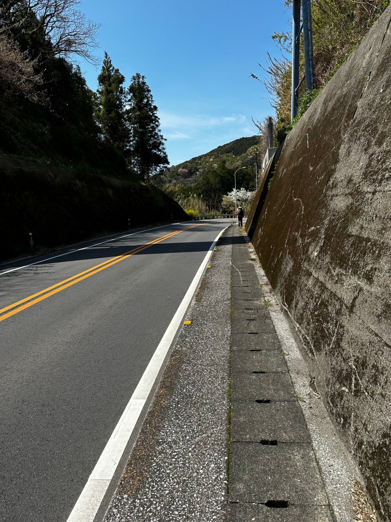 After that, it was a four hour hike from Kanjizaiji to the lodgings at Nishiyugyo Center reserved by Nakamura-san (we found out his name) the previous evening. There wouldn’t be many opportunities for a restaurant along the route so we stopped in at Lawson before leaving Ainan Town and Kanjizaiji behind. Also, traditional Japanese breakfasts don’t offer much in the way of bread or pastries, so we grabbed some juices and something sweet. A chocolate cream-filled eclair for me.