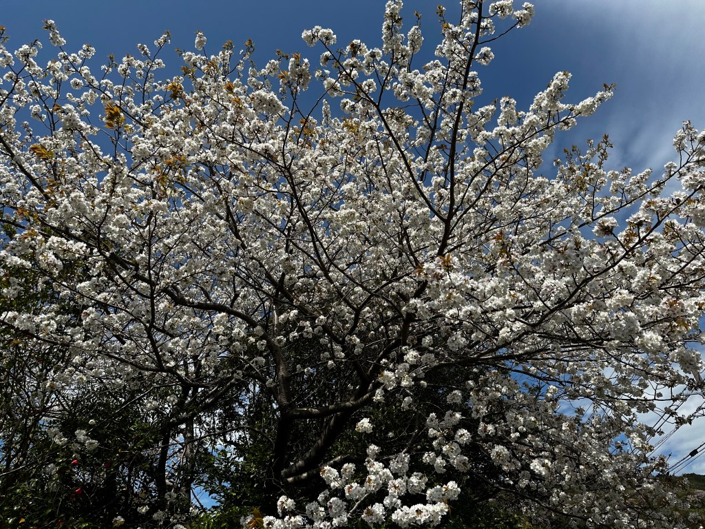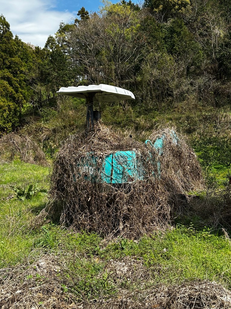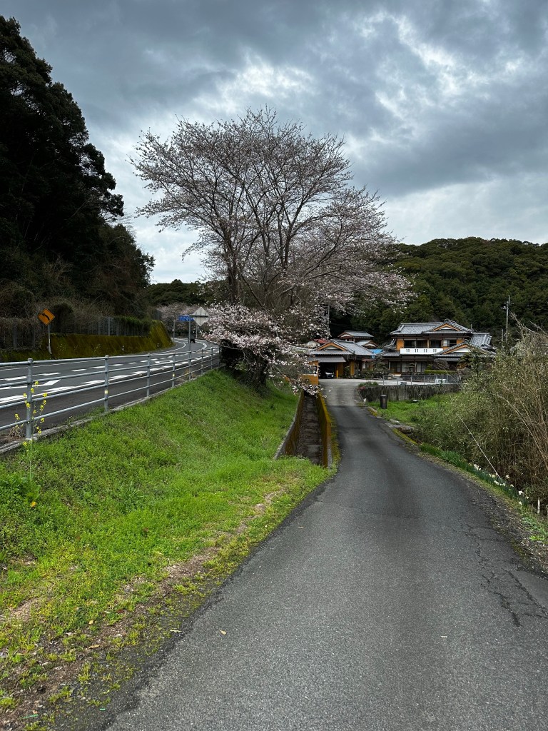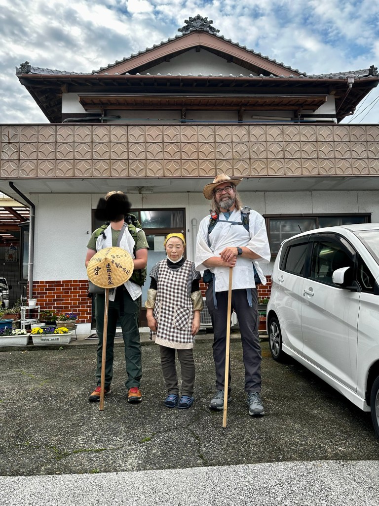 After lunch, we passed a man who was washing a car on the property and he seemed fine with us being there, so the question of private vs. public is now moot. We were about to start our ascent back to the road when the young woman from earlier came up behind us and asked if we wanted a ride in her car. “Ue made?” [Until up?] We gladly accepted the ride back up to the main road. It’s not cheating for a walking pilgrim if it’s a ride back to where you left off. Her name was Naoko. She was very friendly and insisted on getting out of the car and shaking hands with both of us before she left with a smile and a wave.