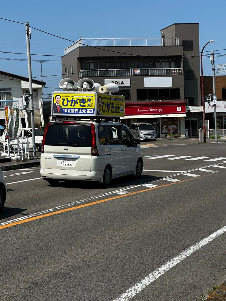 It’s political season in Japan. You would see people riding around in cars dressed entirely the same (colorful jumpsuits with white gloves). Someone would be reading off of a script through the speakers on the roof of the car and the occupants would all be waving out the windows as they passed by.