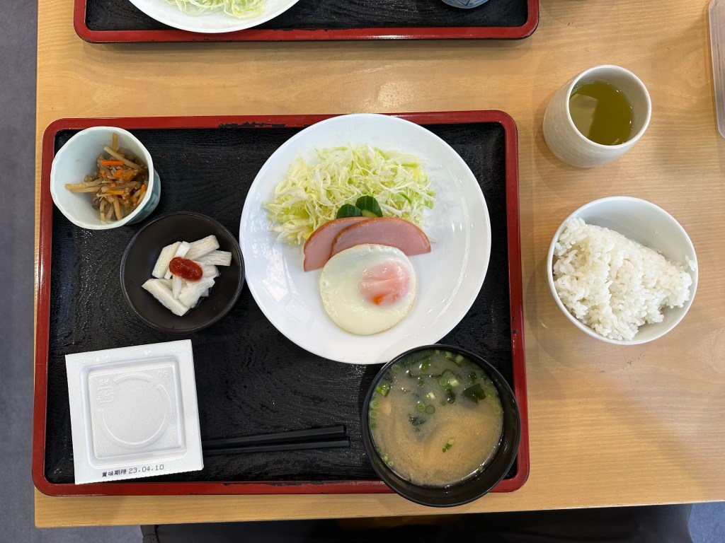Breakfast at Business Hotel Mild. I did NOT eat the natto (lower left). Connor did make a good effort.