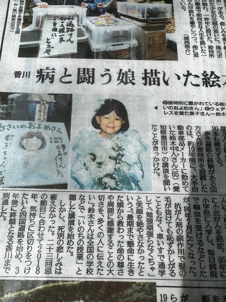 Keiko developed cancer at only three year’s of age and would eventually succumb to that cancer three years later at the age of six. Keiko’s father would go on to promote the “Lessons of Life” campaign all over Japan in support of research into childhood cancers and their treatments. On the 23rd anniversary of Keiko’s death, her father undertook the Shikoku 88 Temple pilgrimage in order to pray for her soul. Unbeknownst to him, several of his friends set up a rest area with refreshments and messages of support addressed to him on the path between Temple 81 and 82. It has now become a permanent ossettai for pilgrims maintained by the people of Kagawa.