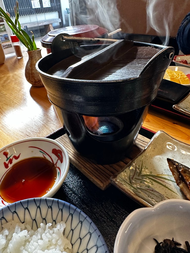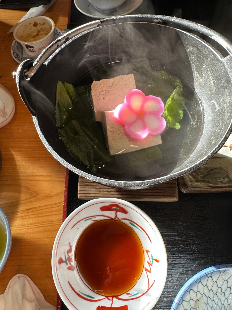 Breakfast at Takeyashiki. The hotel was the among the most expensive place we’ve stayed during this trip, though down in Cape Ashizuri may have been just as expensive. It was more of a “retreat” hotel than a pilgrim lodging, but there were only two hotels to choose from in this area and Takeyashiki was closest to where we needed to get this morning.When the fuel for the flame runs out, the dish in the pot is ready.Contents of the pot with the dipping sauce. The pink/white flower is a type of pressed and molded fish cake.